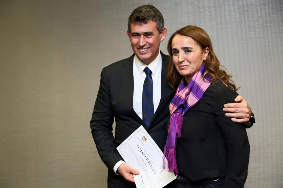 Türk Metal Sendikası Genel Başkan Yardımcısı Yusuf Ziya Odabaş ile Genel Eğitim Koordinatörü Ekin Yıldırım Hanım'a teşekkür belgeleri Proje Başkanı Av. Sema Aksoy, Proje Koordinatörü Av. Tülay Bekar'ın katılımıyla birlikte Türkiye Barolar Birliği Sayman Üyesi Av. Sabri Erdal Güngör tarafından takdim edilmiştir.
